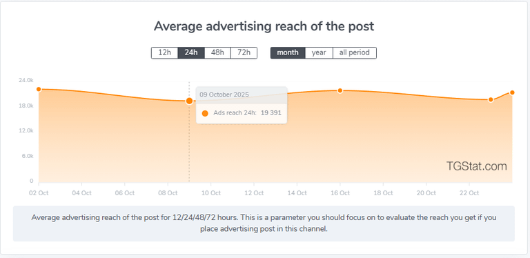 - Alcance publicitario promedio por publicación. Refleja el número de vistas dentro del propio canal, excluyendo las republicaciones. Es útil para una evaluación objetiva de la efectividad de la colocación de contenido directamente en la plataforma seleccionada.